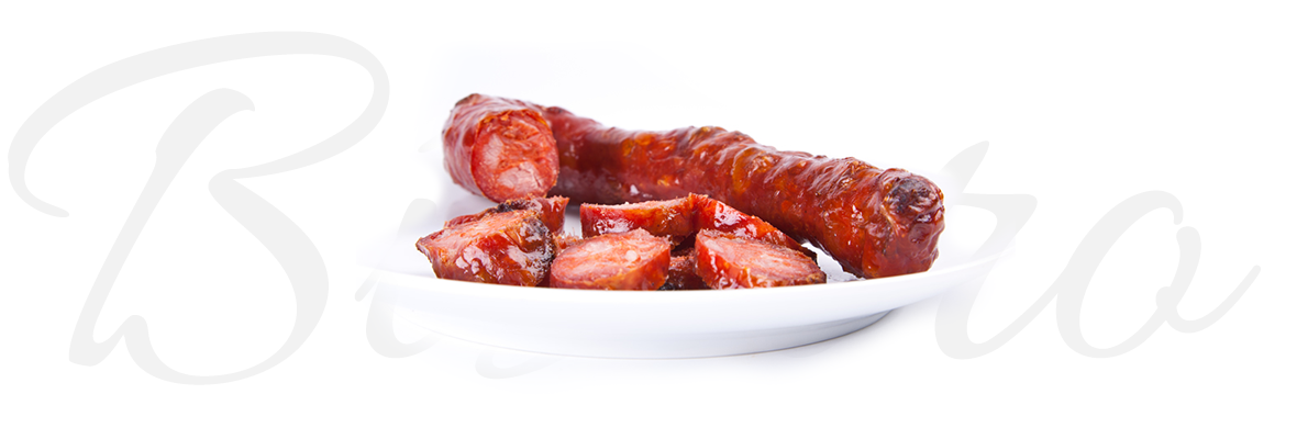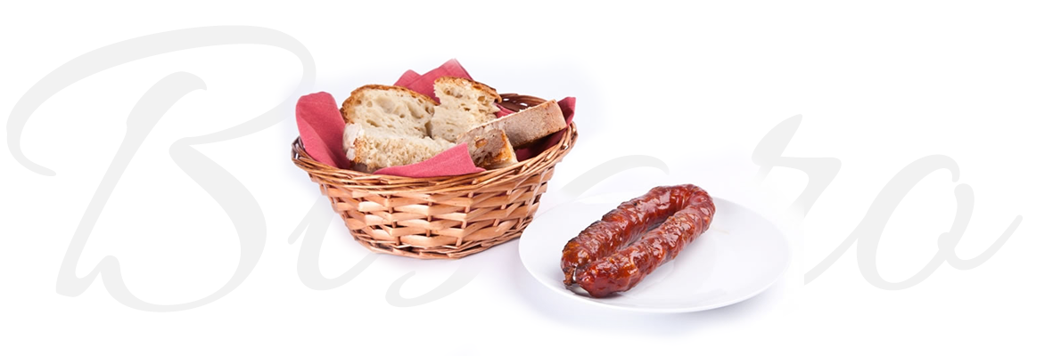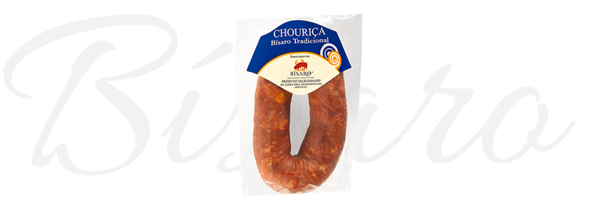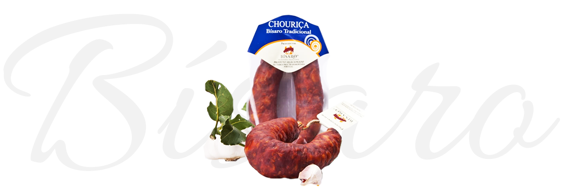 Composição: Perna e barriga de porco de raça bisara, água, vinho branco, sal, colorau, alho, louro, tripa de Porco.