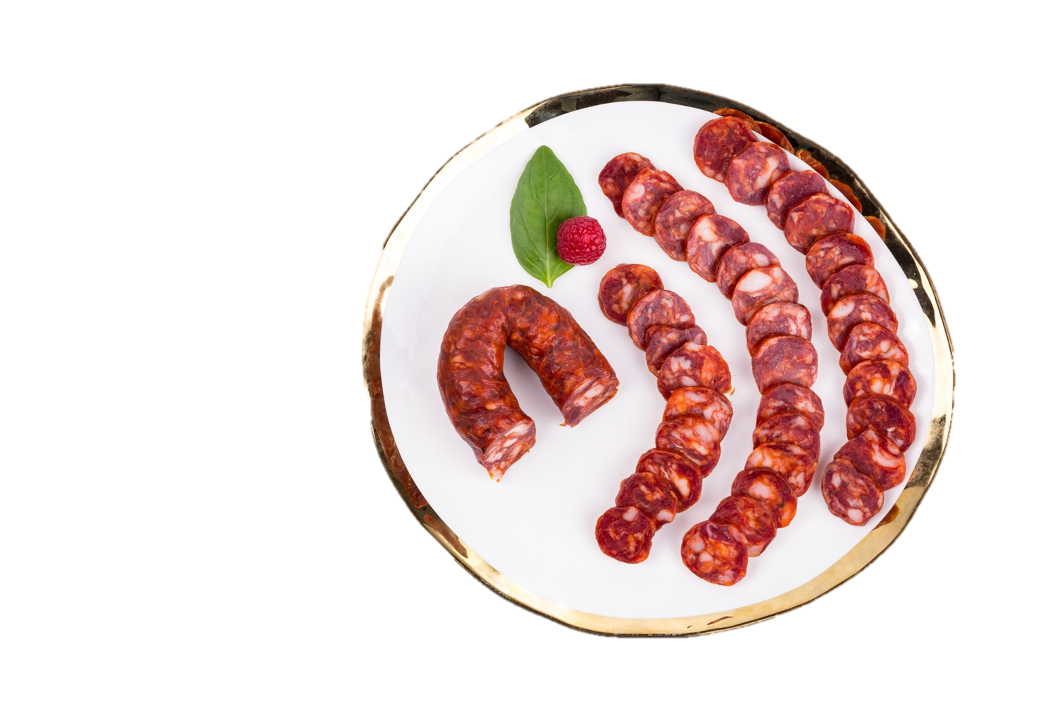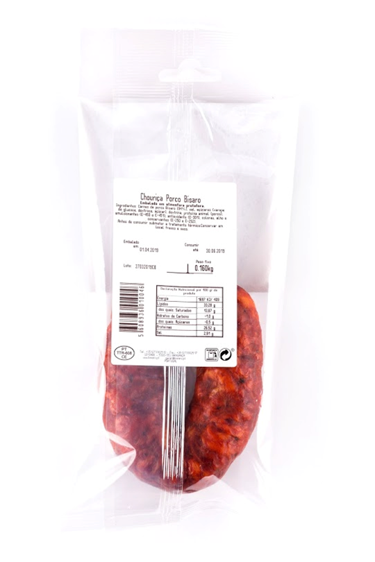 A chouriça é um enchido feito com carnes frescas, da perna e barriga de Porco Bísaro Criado em Campo, picadas e condimentadas com colorau, louro, alho e sal.