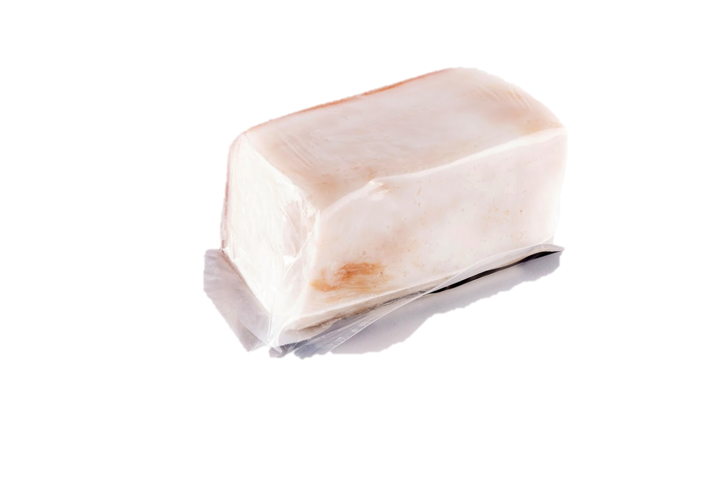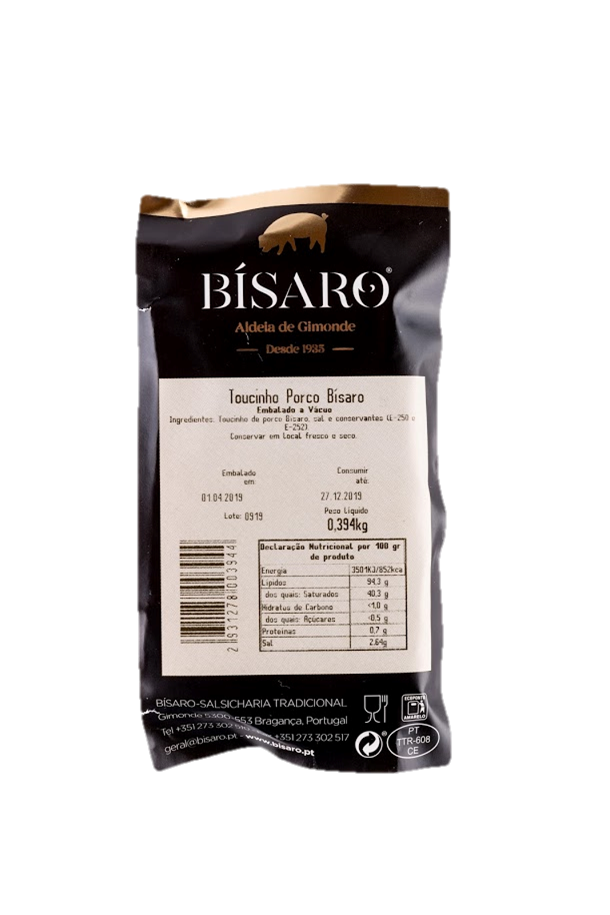 Carne gorda da barriga do porco de raça bísara. Toucinho de porco Bísaro, sal e conservantes ( E-250 e E-252).